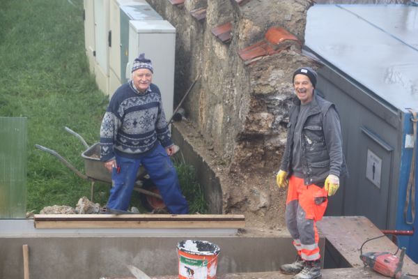 Heizung-, Wasser- und Elektroinstallationen vorgenommen, Diverse Maurertätigkeiten, Estrich aufgebracht, Stukateurarbeiten durchgeführt, Fußbodenheizung verlegt, Pflasterarbeiten im Innenhof abgeschlossen, Fundamente für Carport betoniert, Isolierung verlegt, Pellets befüllt, Heizung in betrieb genommen, Sitzstufenfundamente betoniert, Sitzstufen gesetzt,
